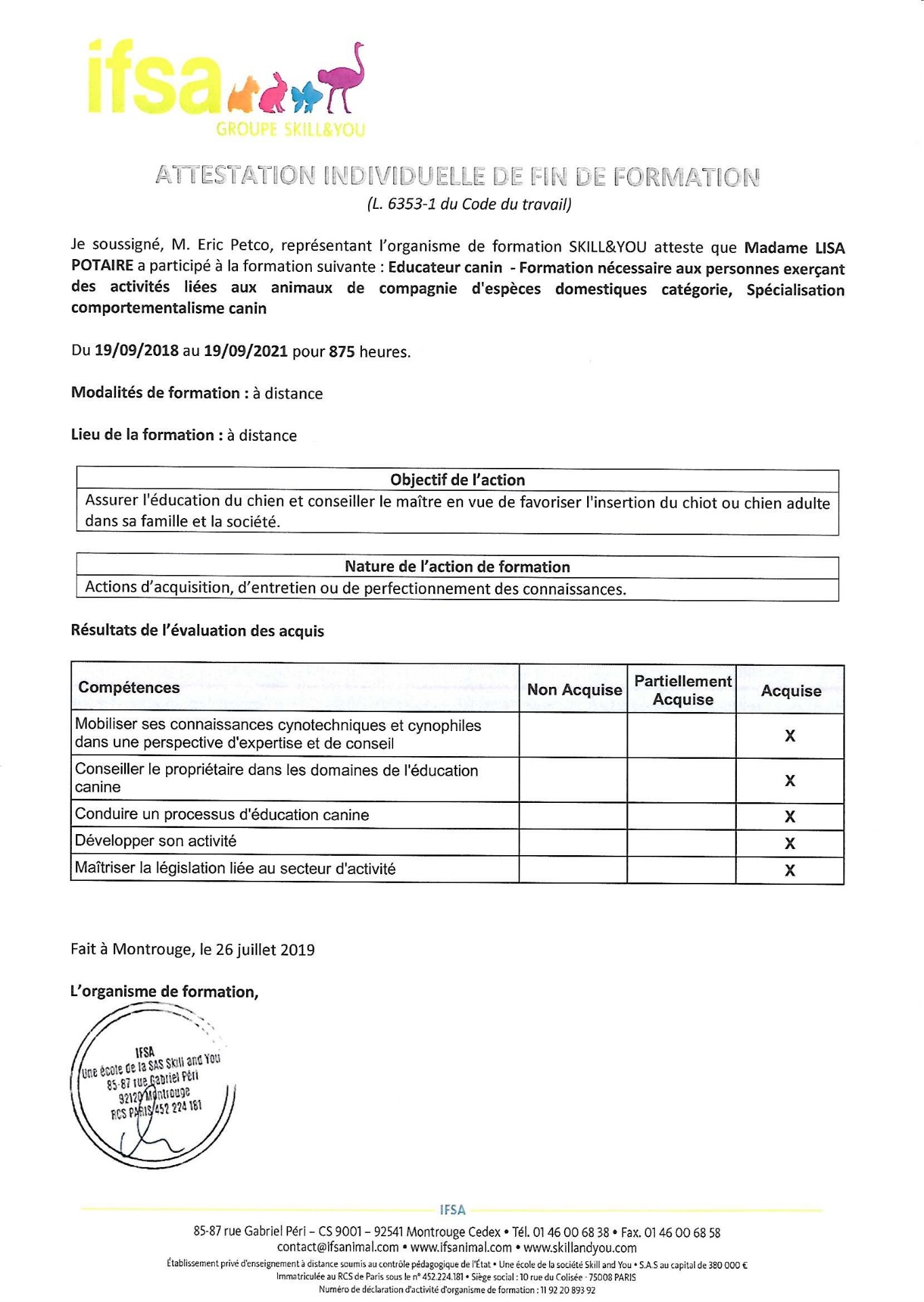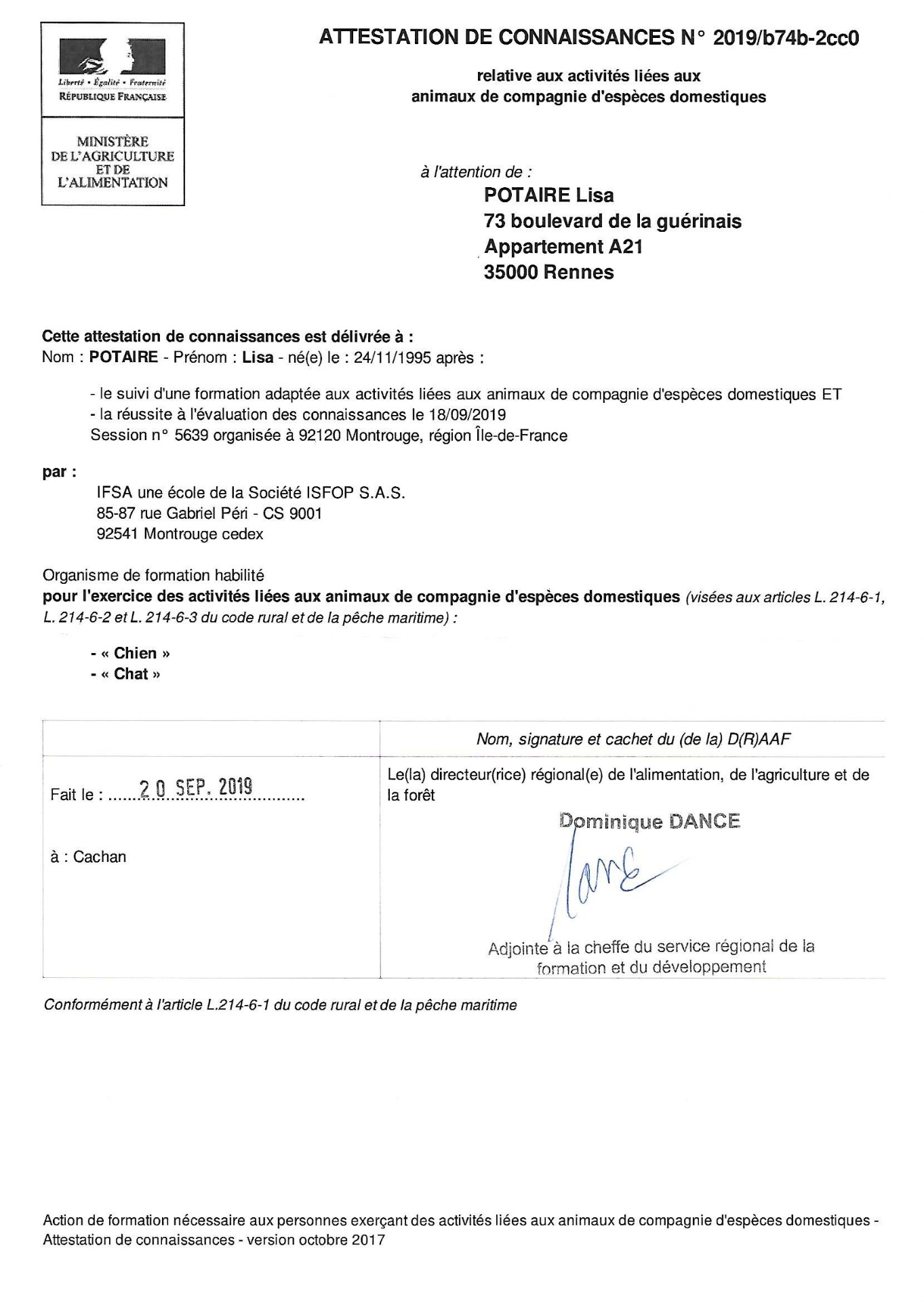 J'ai obtenu l'Attestation de Connaissances pour les Animaux de Compagnie d'Espèces Domestiques (ACACED) le 18 septembre 2019.